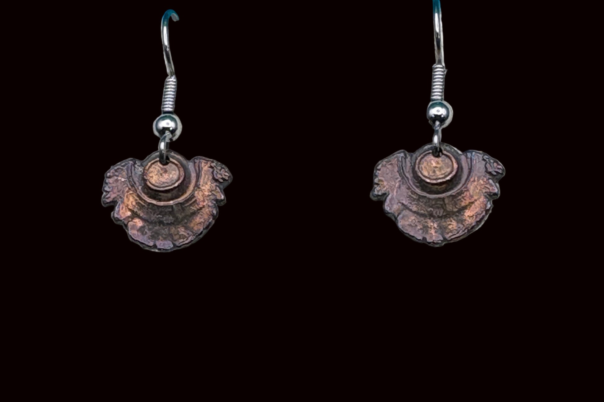Fine Silver (.999) dangles with a unique patina added for color. Approximately 14mm across.