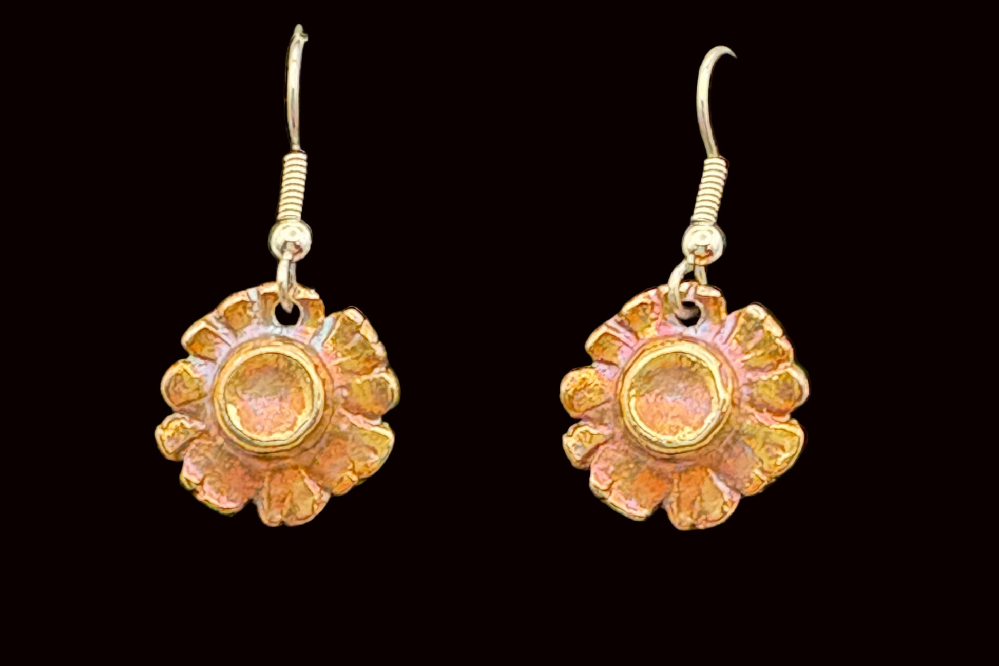 Fine Silver (.999) dangle earrings with an applied patina to give color. Approx. 11mm in diameter.