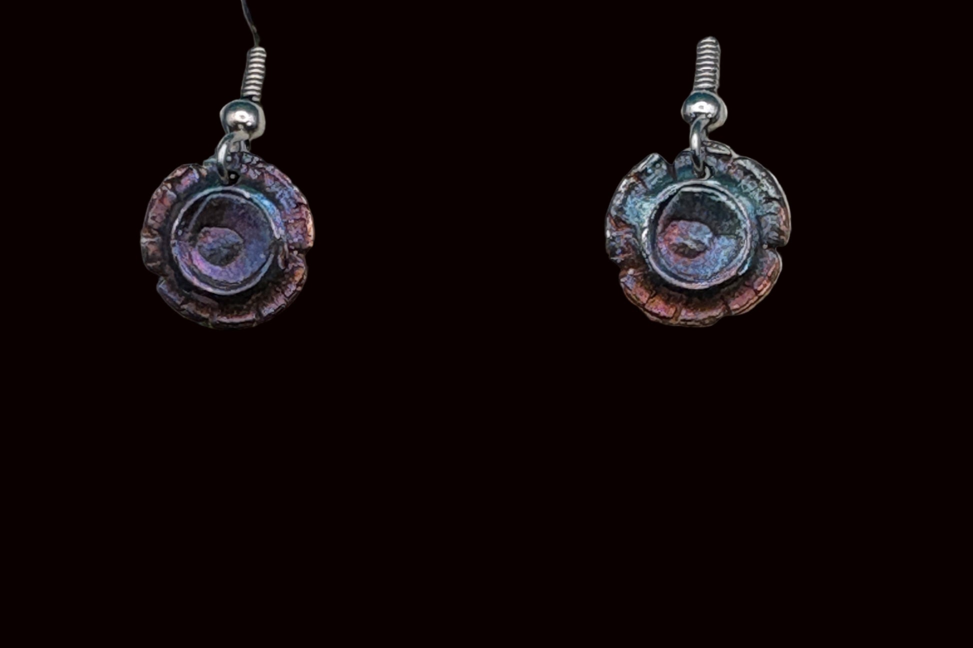 Fine Silver (.999) dangle earrings with an applied patina to give color. Approx. 12mm in diameter.