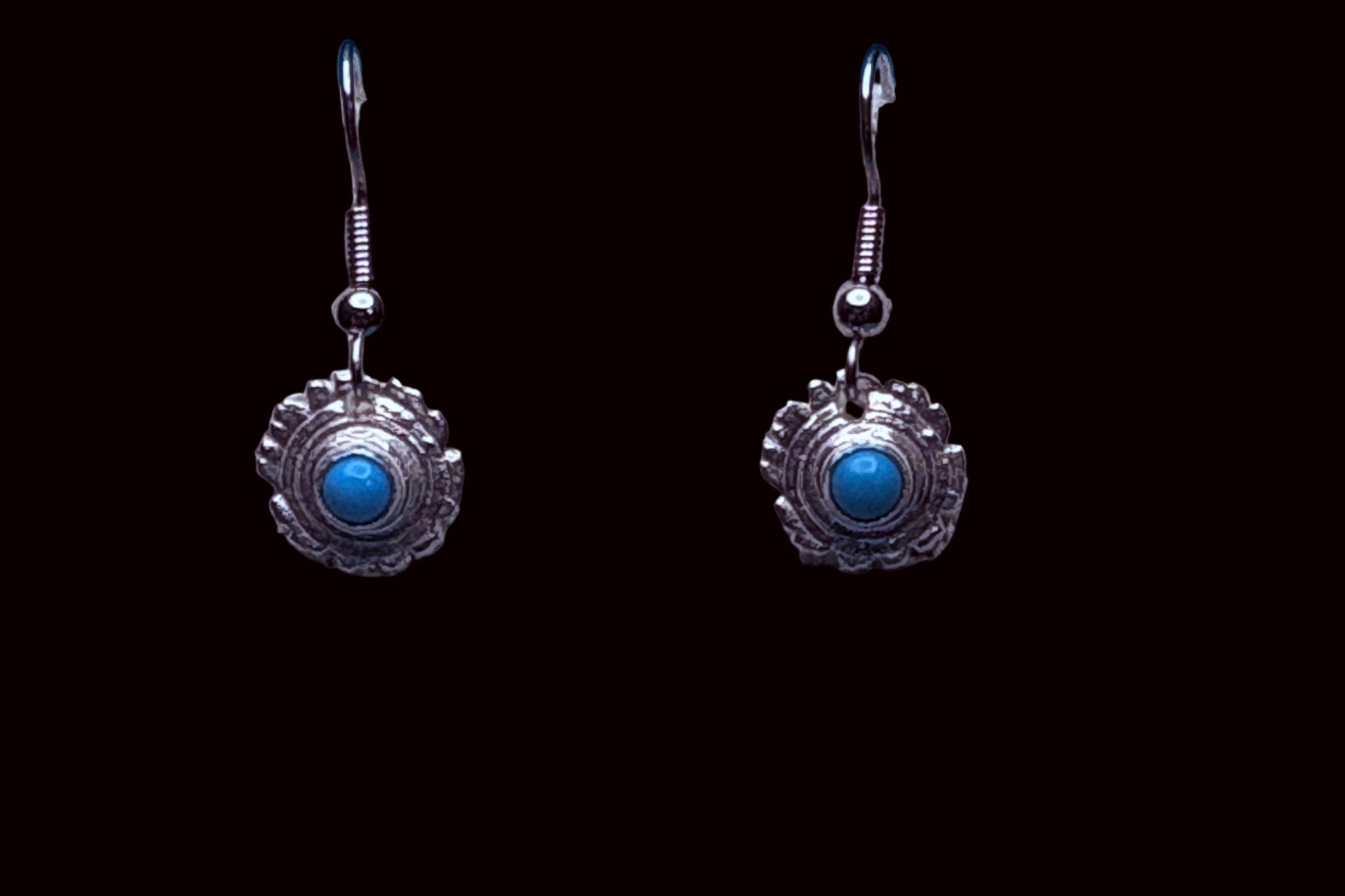 Fine Silver (.999) dangle earrings with Sleeping Beauty Turquoise cabochon stone in the center. Approx. 11mm in diameter.