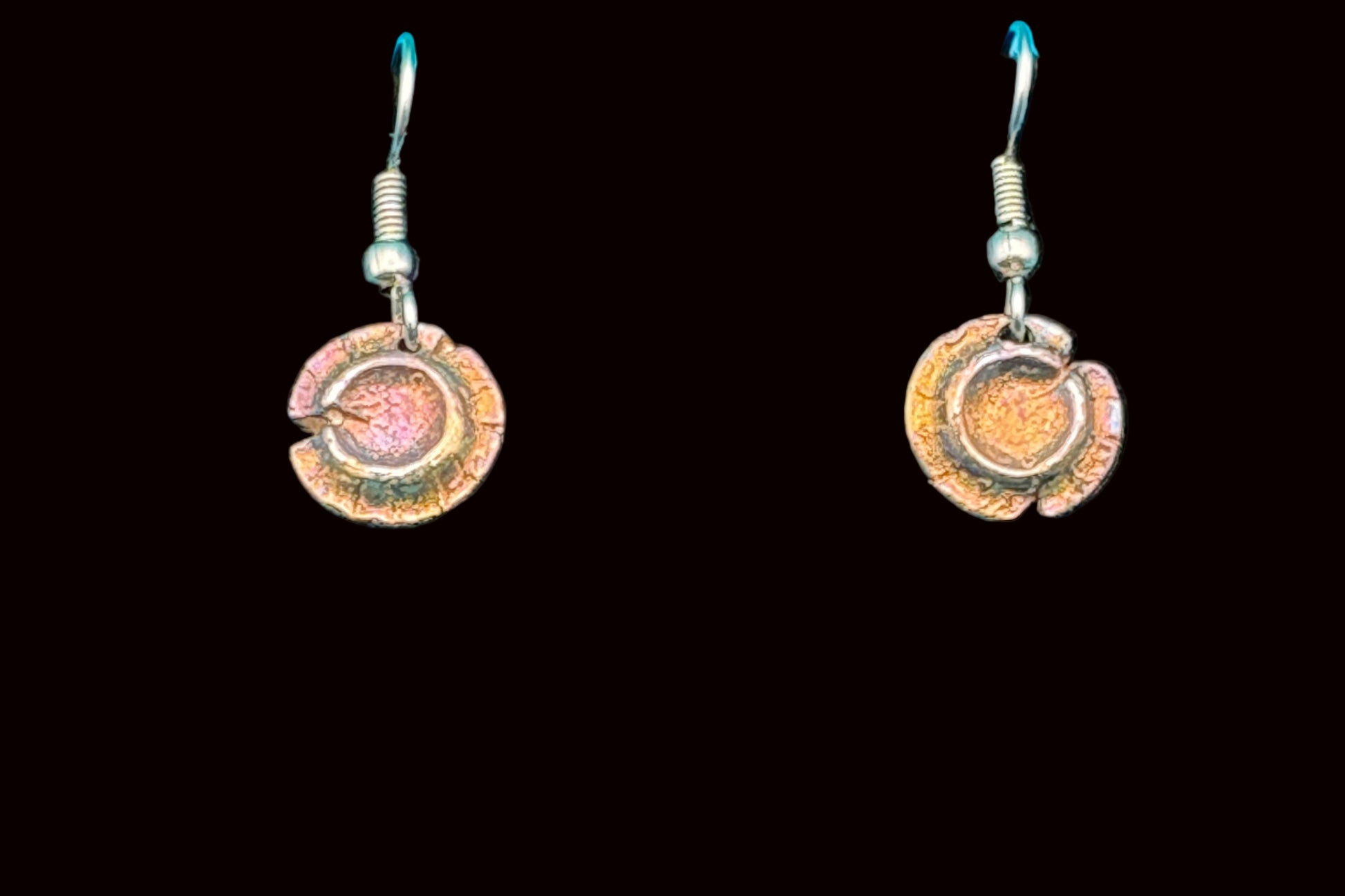Fine Silver (.999) dangle earrings with an applied patina to give color. Approx. 12mm in diameter.