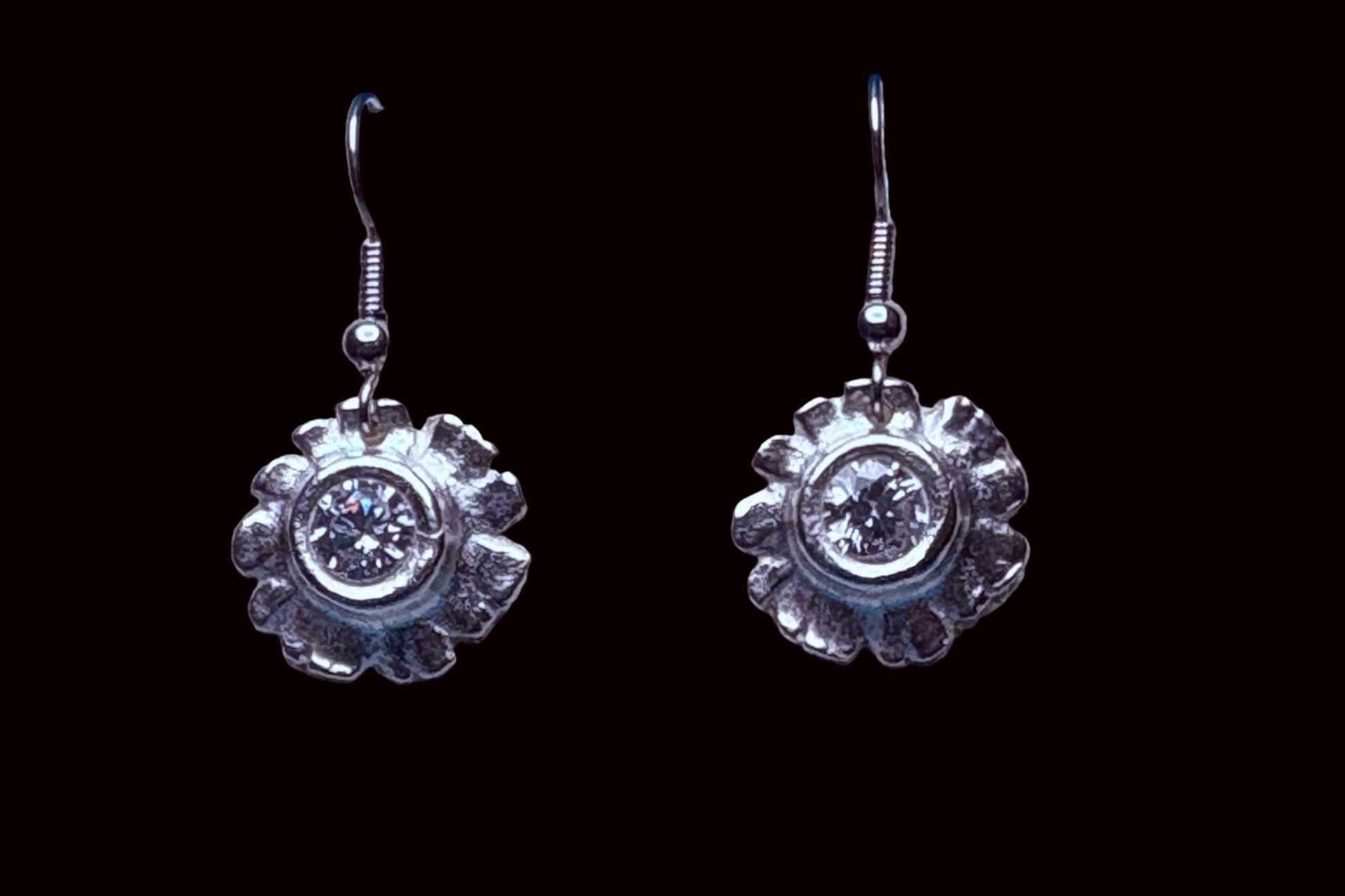 Fine Silver (.999) dangle earrings with clear CZ stone in the center. Approx. 11mm in diameter.