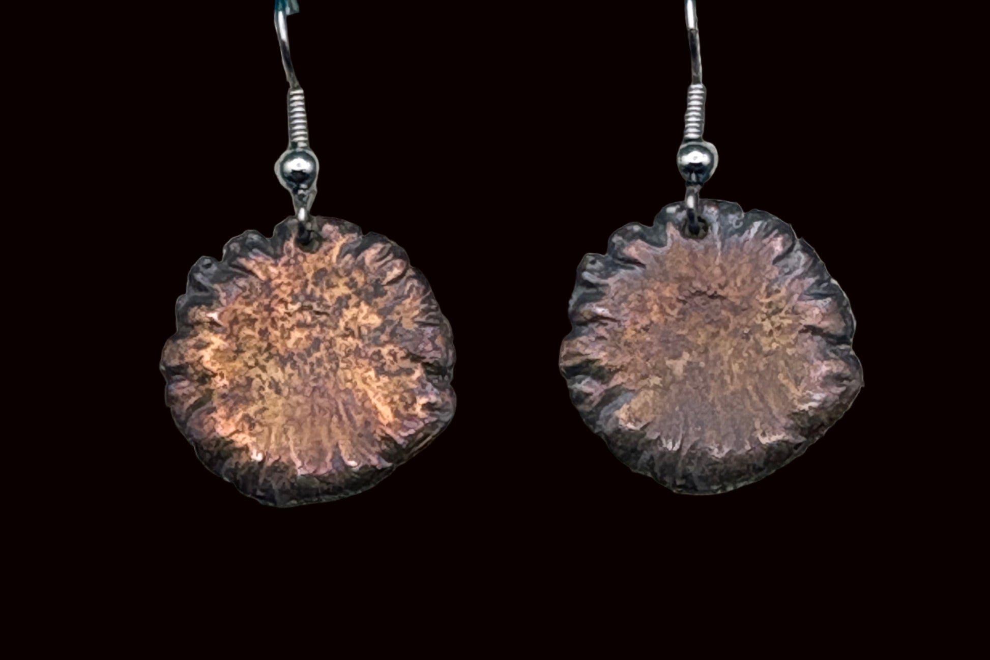 Fine Silver (.999) dangle earrings with a unique patina for added color. Approximately 20mm in diameter.