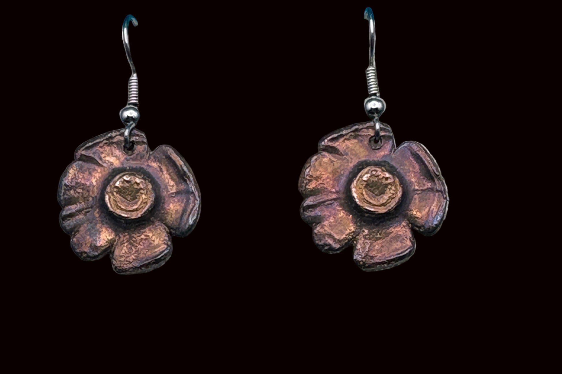Fine Silver (.999) dangle earrings with an applied patina to give it color. Approximately 20mm in diameter.