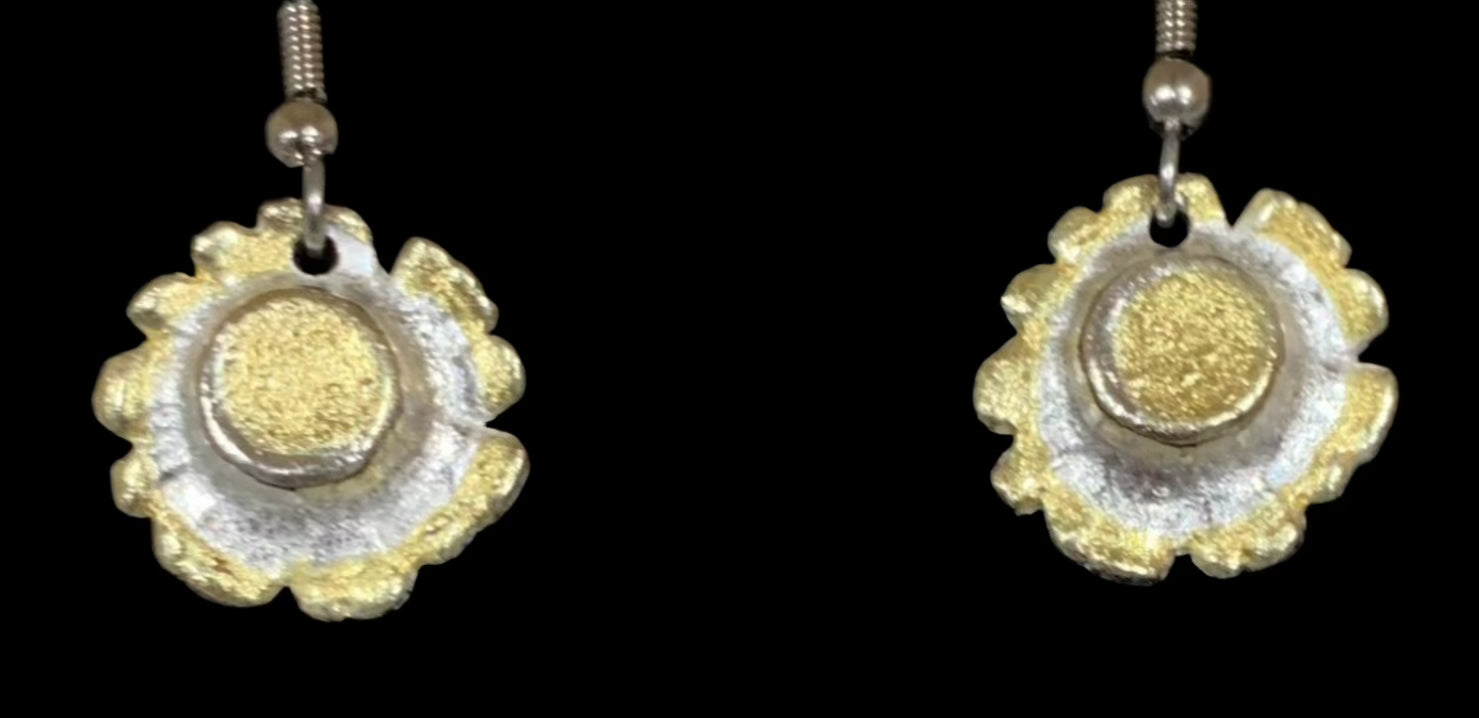 Fine Silver (.999) dangle earrings with 22k Gold accents. Approx. 17mm in diameter.